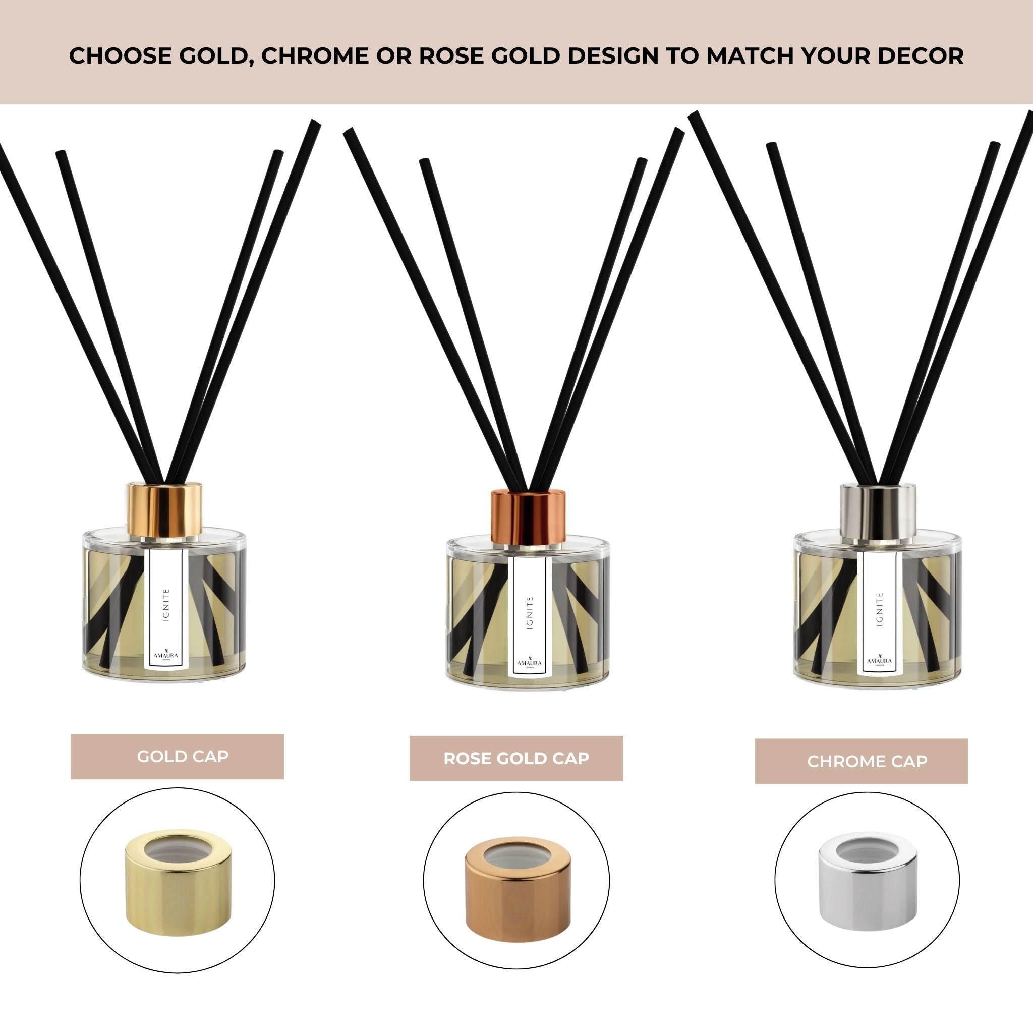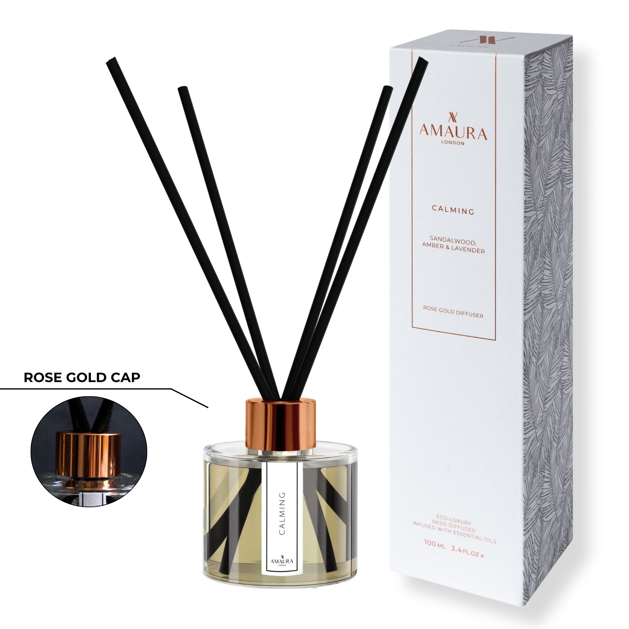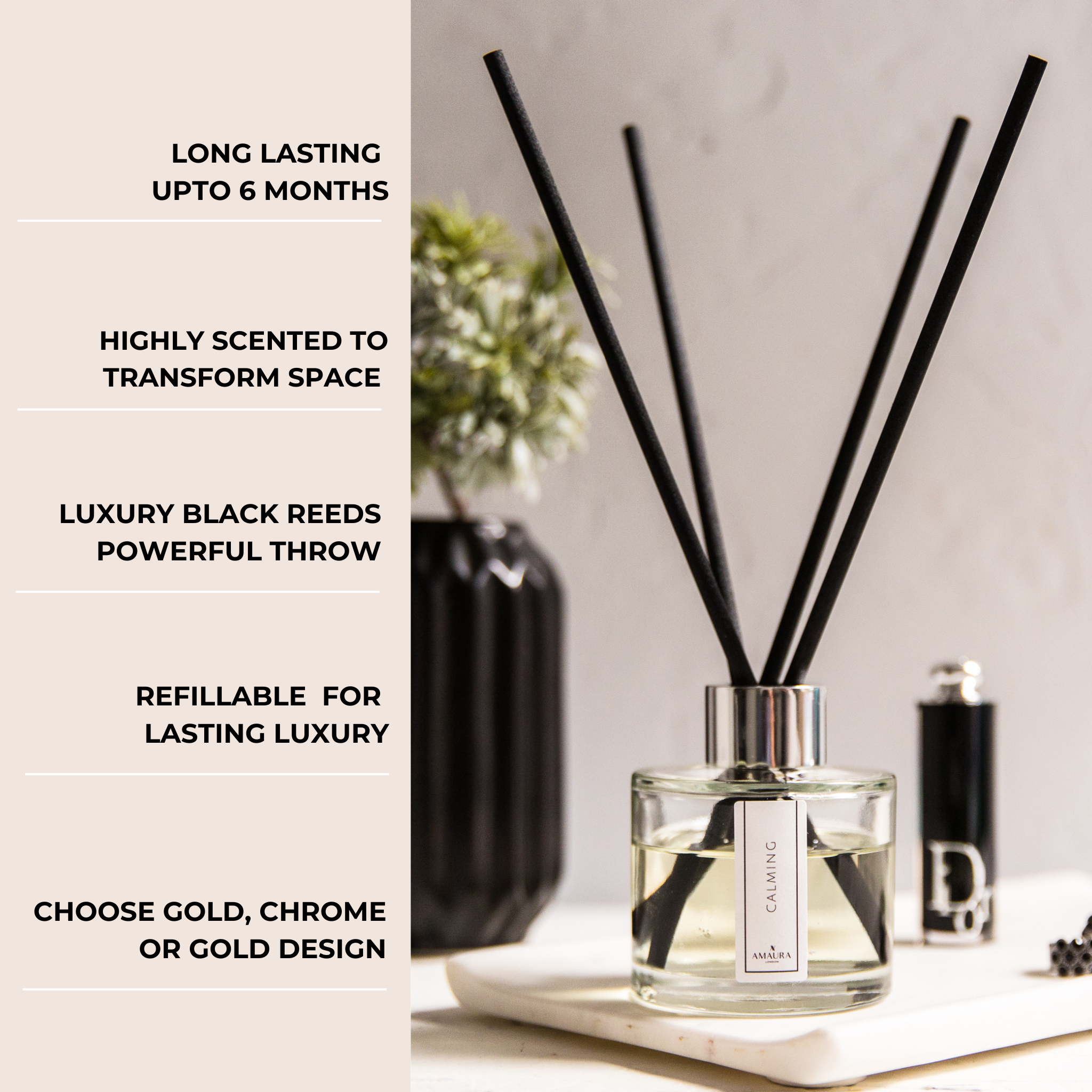 Amaura London reed diffusers work by absorbing the fragrance oil up through our striking black reeds. Because they are porous, they slowly release the scent into the air, leaving a lingering scent. Our striking black reeds are made from high-quality cotton fibre reeds and are specially designed for a longer, more consistent diffusion without drying up, clogging or moulding like cheaper wooden reeds.