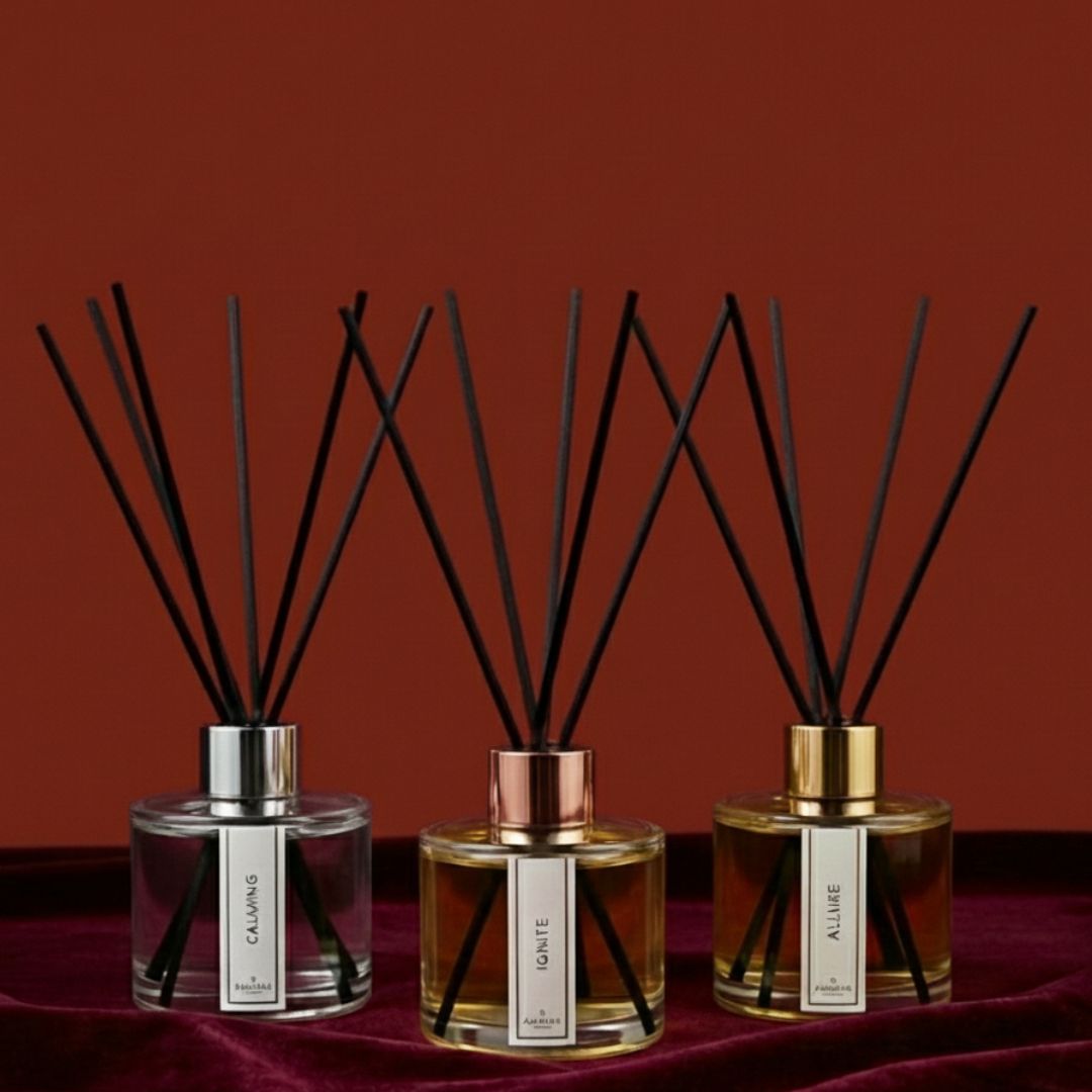 Calming (Sandalwood, Amber & Lavender) – “Wrap yourself in a heavenly scent of sandalwood, amber and lavender.” Crafted to transform your space into a sanctuary for unwind, this reed diffuser blends warmth and softness for restful moments.